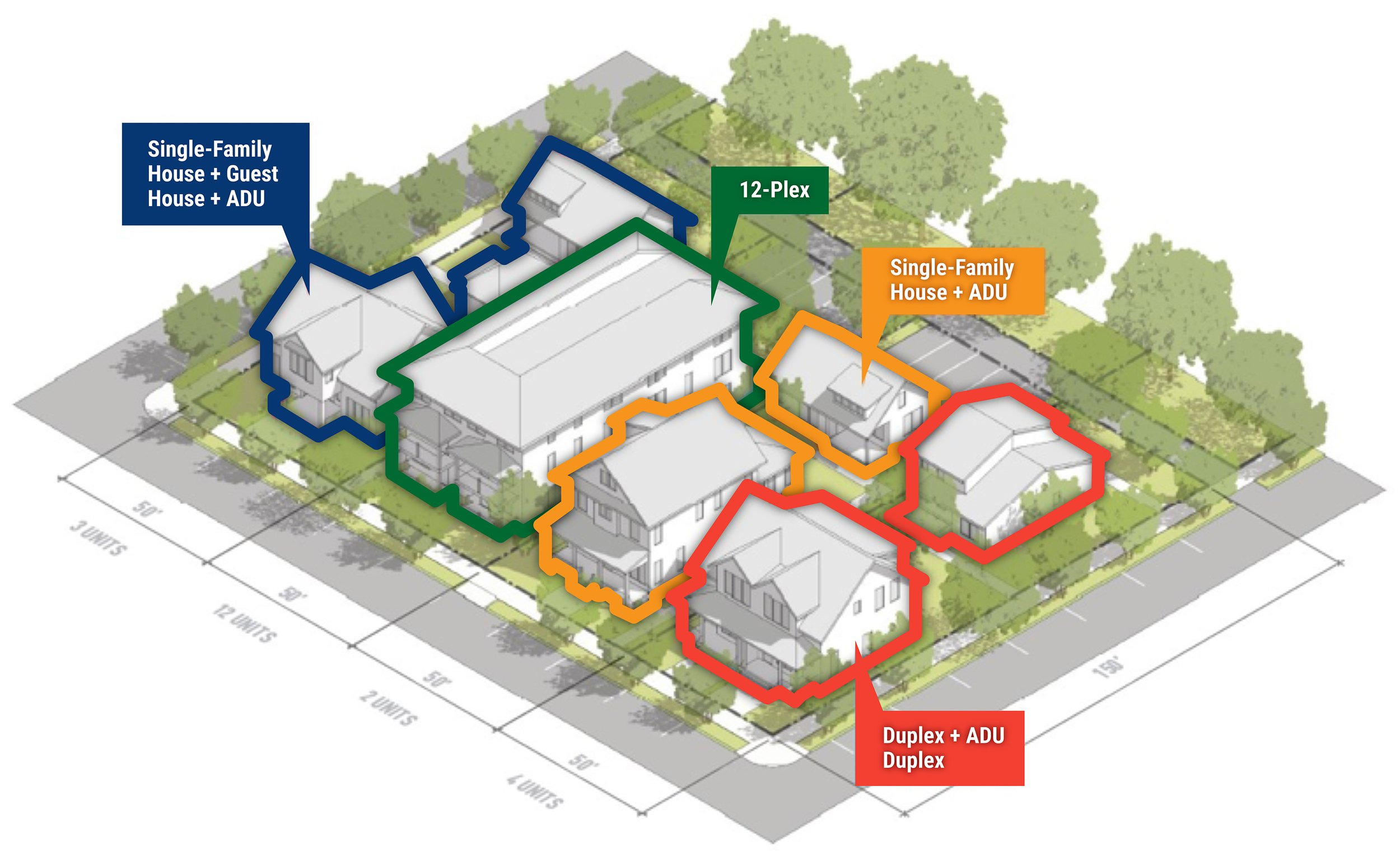 In practice, not every lot will maximize all the available units. There will (and should) be a range of densities. Having a six- or twelve-plex on a corner lot at a higher density can help balance out multiple lots with only a house—or a house with an ADU. When you look around older neighborhoods (built 1880-1929), you might see the image above as a typical development pattern.