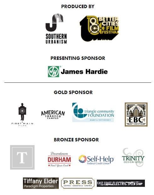 I am thrilled to announce that for the first time, the Better Cities Film Festival is coming to the South and has chosen Durham as its prestigious host.