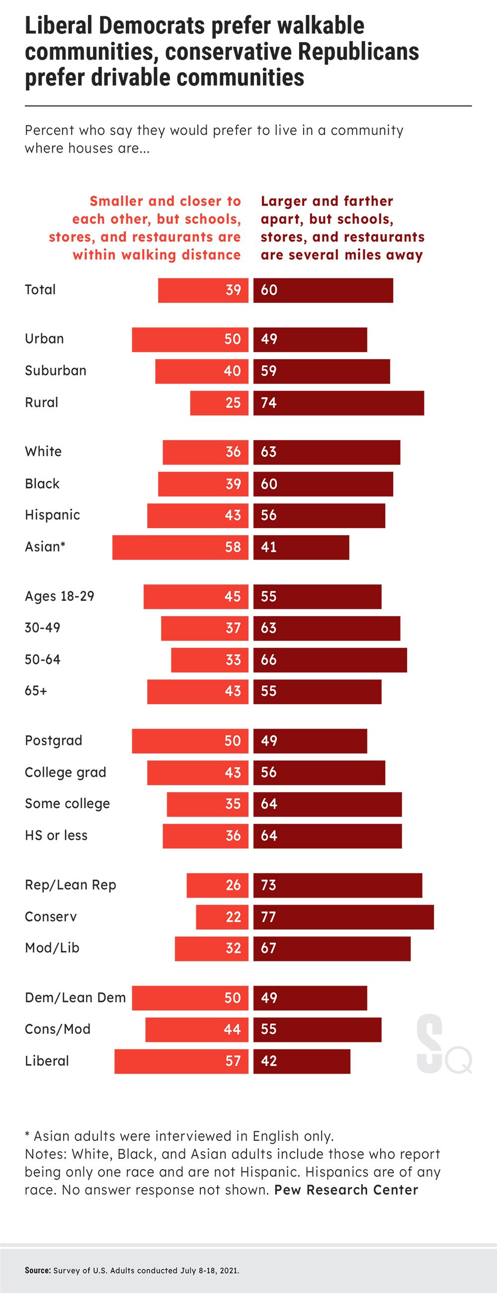 In early December 2021, the blog Marginal Revolution linked to a study showing that NIMBY (“not in my backyard”) sentiment and hostility toward density are quite popular.* I was not surprised, since earlier in 2021 Pew released polling showing that, in the U.S., only a clear majority of liberal Democrats prefer walkable communities and small homes to car-dependent sprawl and big houses. Yet the blog commenters did surprise me by totally ignoring three important factors that are also absent from most debates about housing: The gravity of the affordability crisis, consumer demand for dense housing, and car dependency.