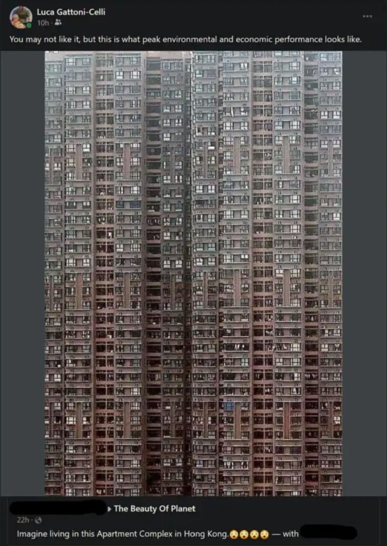 I found the same kind of hostility toward density on Boxing Day 2021 in a neoliberal Facebook group, a pretty similar online space that leans left politically. I had shared my own reframing of this alarmist post depicting a massive Hong Kong apartment complex: