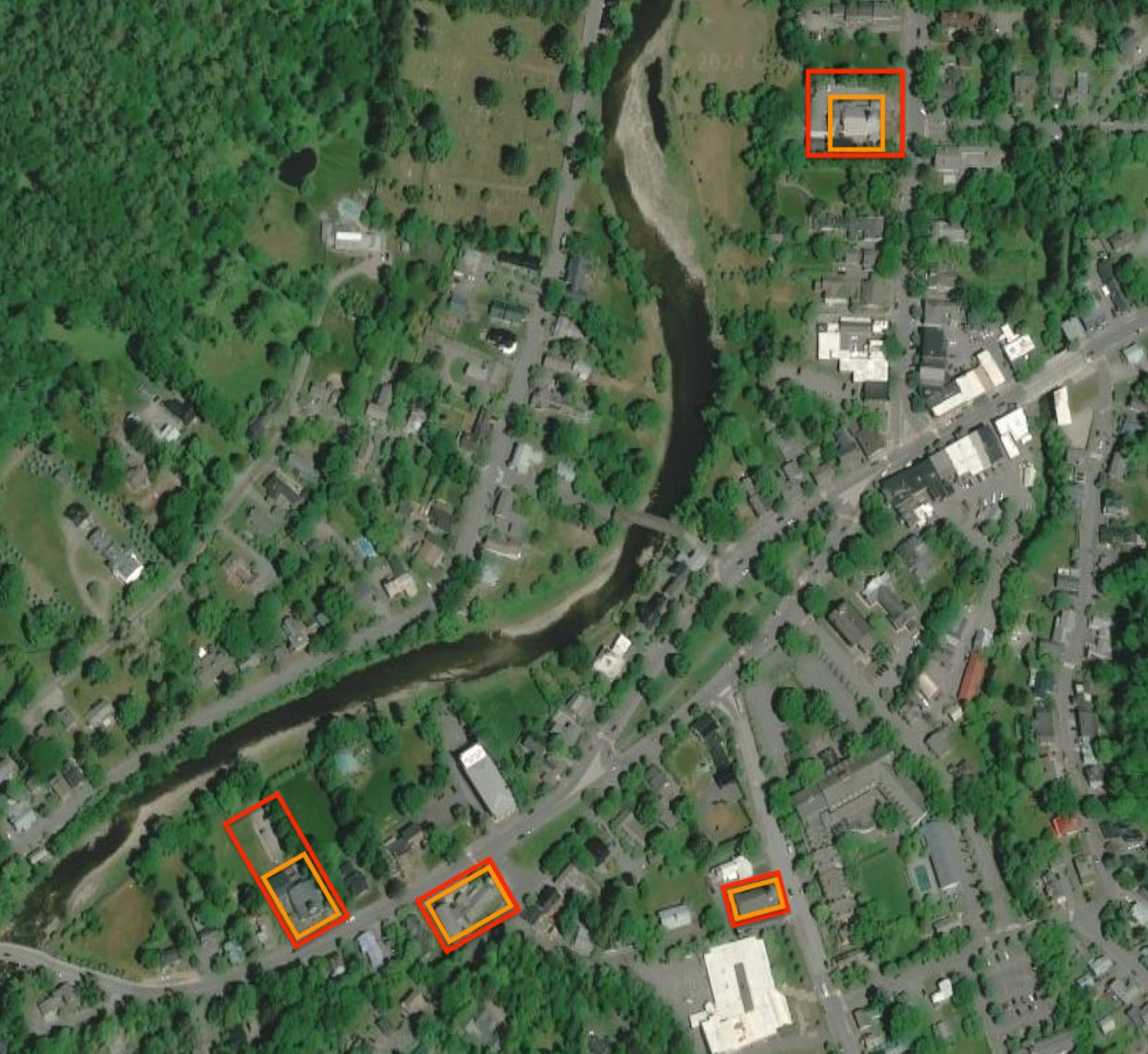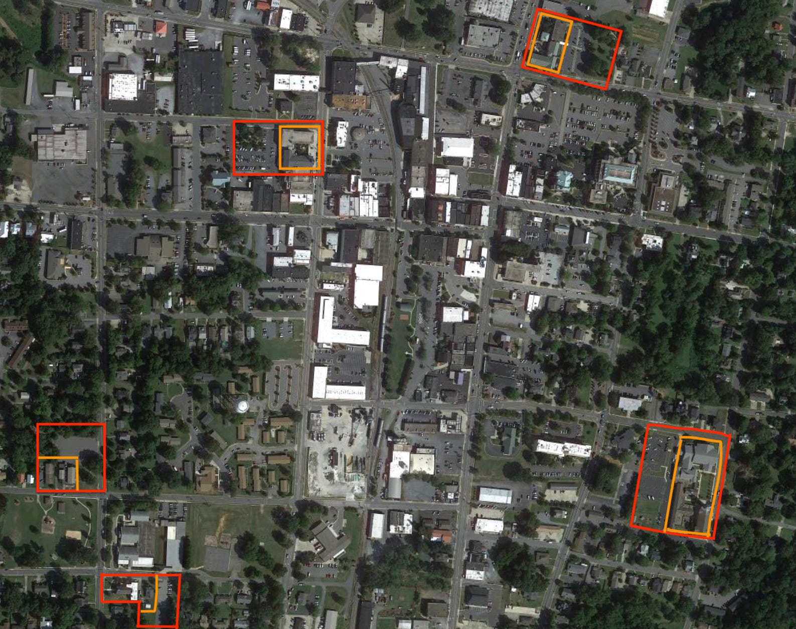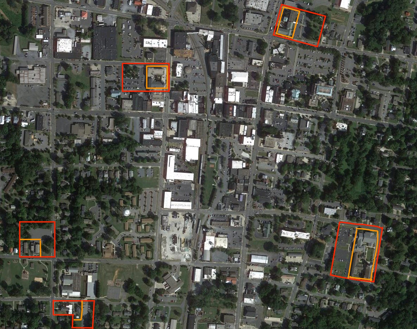 The church properties here are boxed in red, with the actual physical churches being boxed in orange. As you might notice, two of the churches occupy the entire plot of land that they sit on. They do not have any dedicated parking (though they are both quite close to a larger lot), nor do they have large unused tracts of land. The two that do have parking have it tucked either behind or beside the main building.