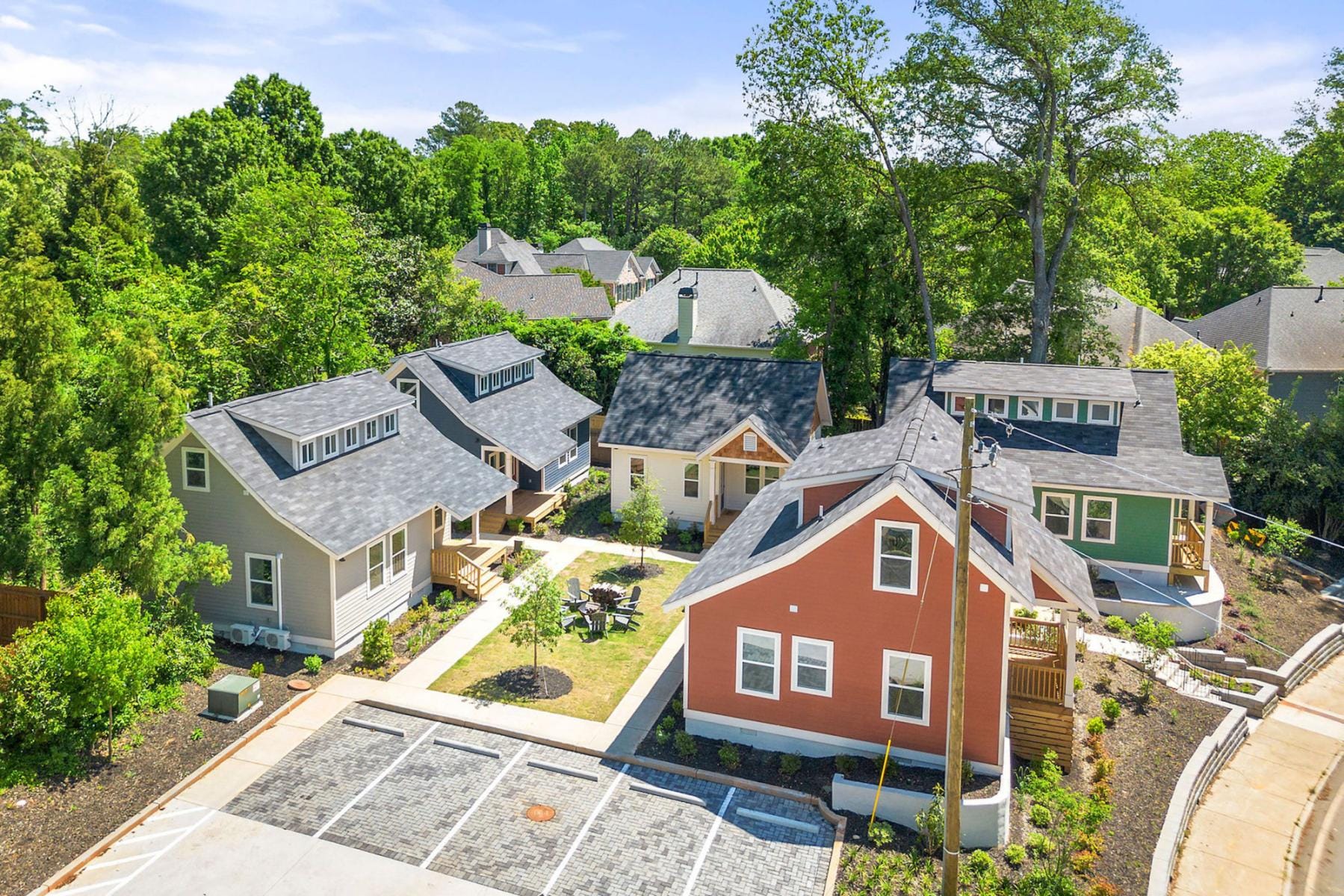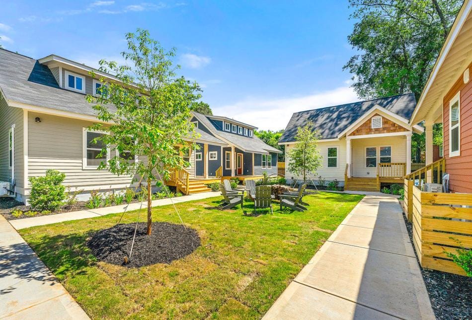 Designing for beauty isn’t difficult—sometimes it’s as simple as planting two trees. Imagine what the cottage court above will look like once those two trees in the middle mature and offer shade to residents relaxing below.
