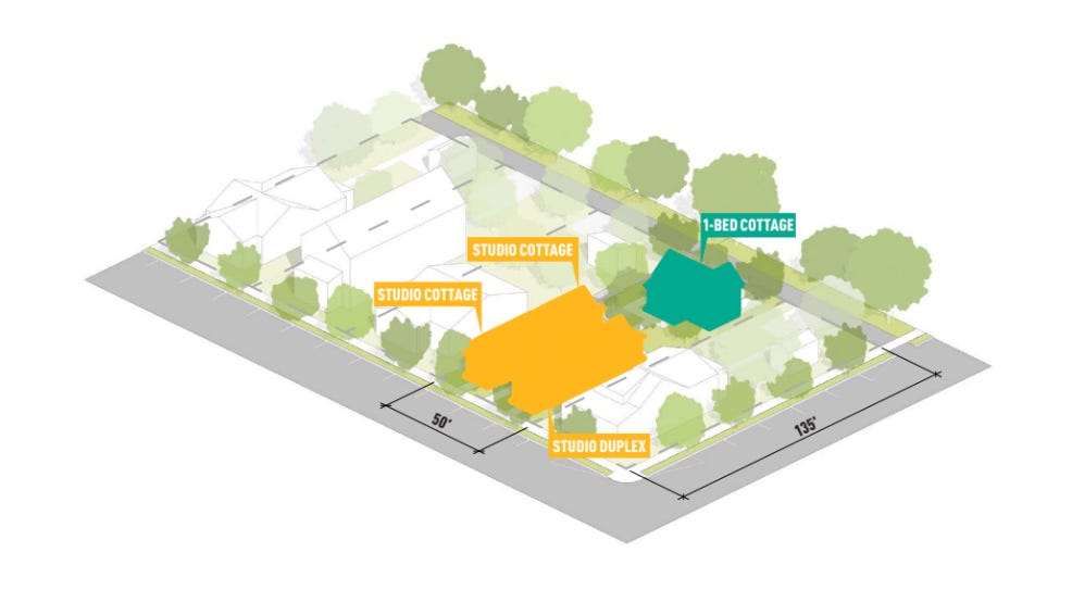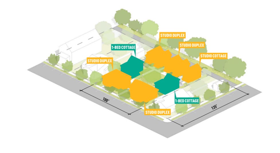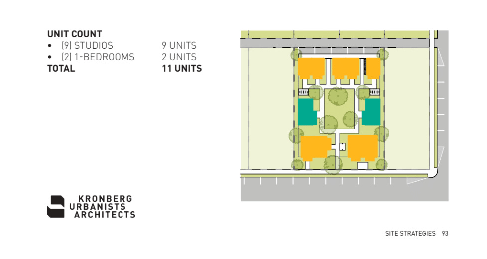 Though the units in this example are still relatively small, the bigger lot would afford greater flexibility to include larger houses like the 1 and 2 bedrooms I talked about last week.
