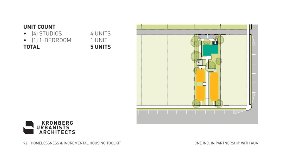 Most houses of worship have more property than this, but much of it can be taken up by the sanctuary, parking, or other existing buildings. These five units, though, could still fit onto the side or back of a lot on an unused field or excess parking.